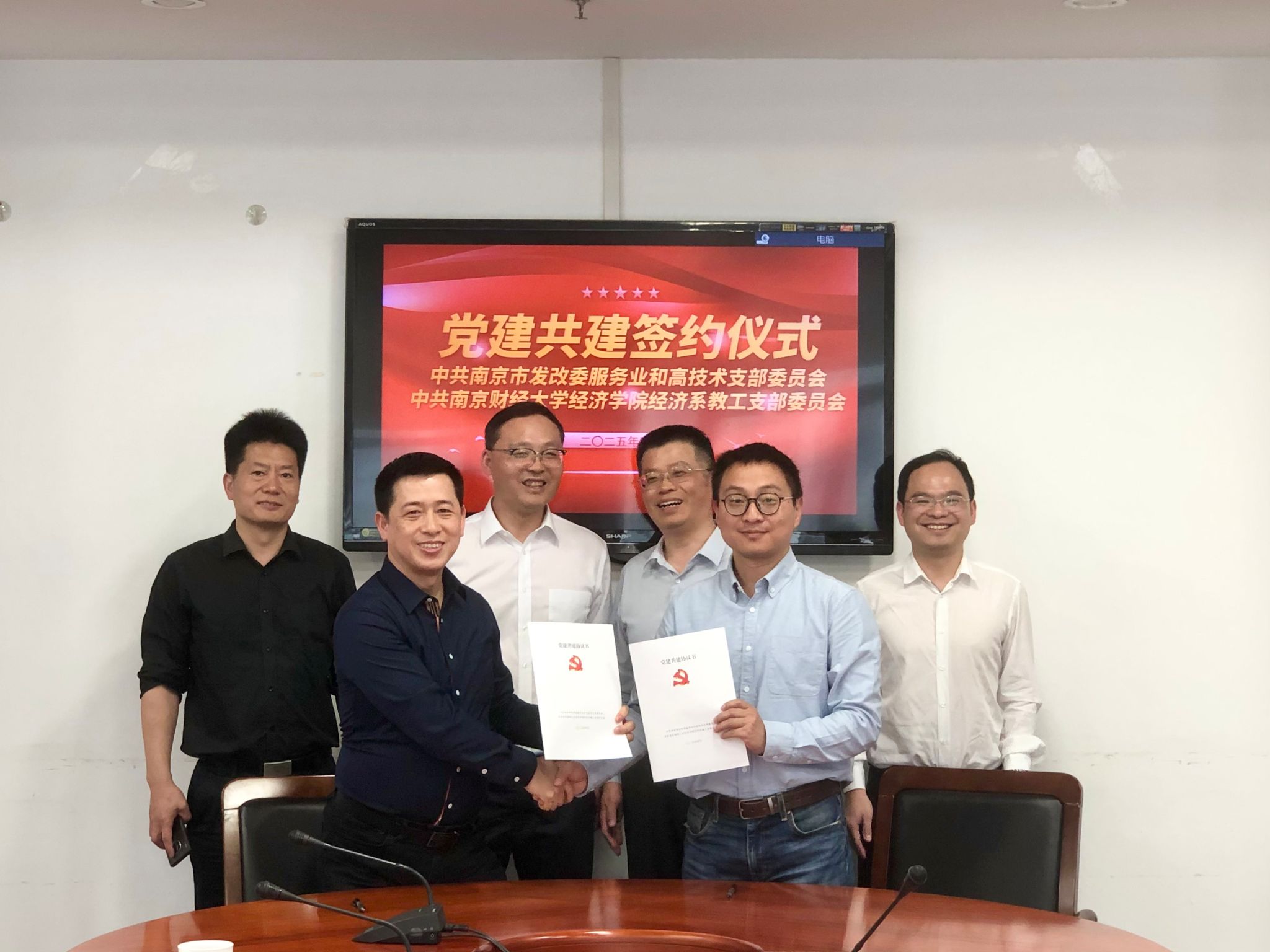随后,中共南京市发改委服务业和高技术发展支部委员会书记胡耀与中共南京财经大学经济学院经济系教工支部委员会书记杨泳冰代表双方签订了结对共建协议,明确未来将在“政治理论联学、组织生活联过、特色品牌联创、招生就业联拓”四大领域深化合作,实现党建与业务“双融双促”,贾尚斌副主任、张圣兵书记、刘小峰副院长等在场人员见证了这一时刻。