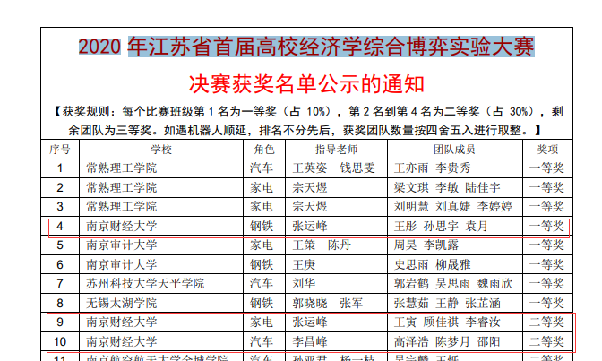 2020年12月,由中国数量经济学会博弈论与实验经济学专业委员会举办的2020年江苏省高校经济学综合博弈实验大赛决赛结束。我院有5支队伍晋级决赛,其中1支队伍获得一等奖,2支队伍获得二、2支队伍获得三等奖。