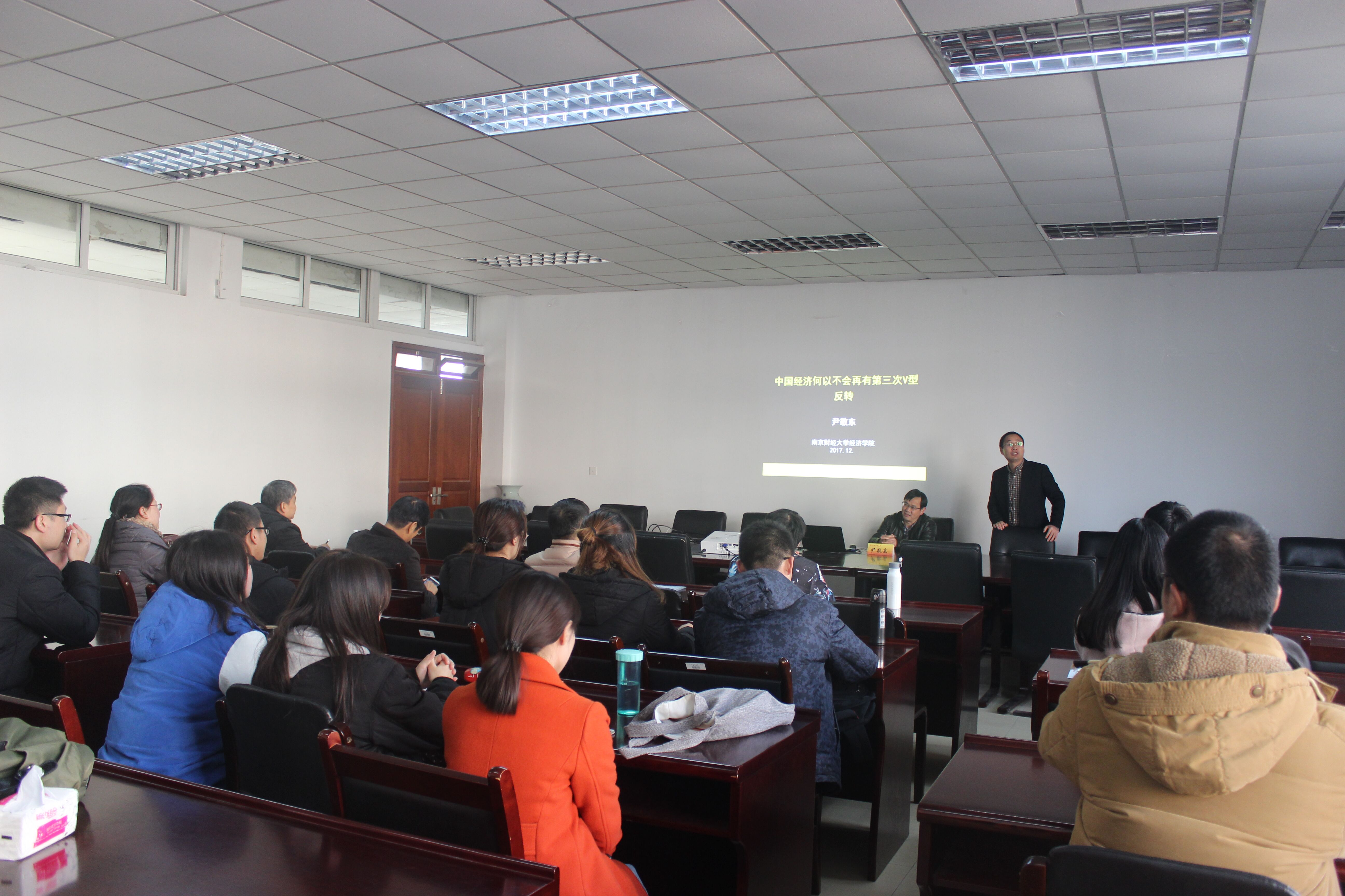 12月11日下午,我院“收入分配与经济增长”学术论坛第19次报告会在德经楼307室举行。报告由我院副院长尹敬东教授主讲,报告题目为“中国经济何以不会再有第三次V型反转”。本次讨论会由我院副院长叶林祥教授主持。