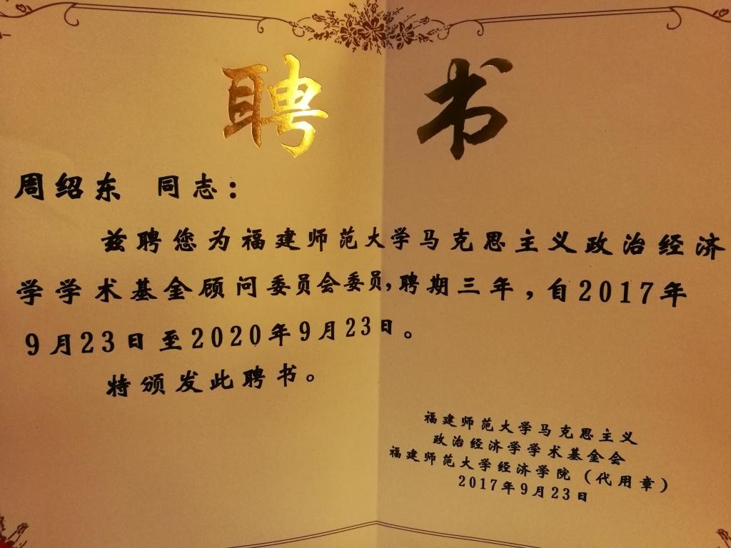 在会议期间,还举办了福建师范大学马克思主义政治经济学学术基金顾问委员会成立暨聘任仪式,我院何干强教授、周绍东教授受聘为顾问。据悉,该基金是由福建师范大学经济学院校友余文辉博士捐款100万元设立的学术奖励基金,顾问委员会由包括著名经济学家卫兴华教授在内的22位全国知名政治经济学专家组成。