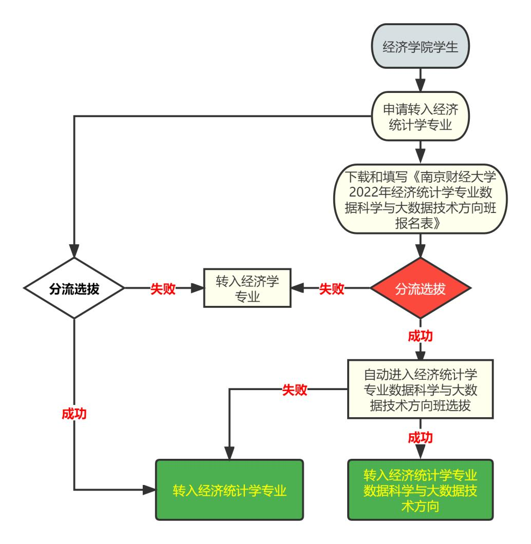 1. 经济学院专业分流。对于有意愿转入经济统计学专业数据科学与大数据技术方向班的经济学院2023级本科生,于5月6日至5月13日期间完成分流志愿的网上报名工作(将经济统计学专业作为第一志愿),同时向经济学院提交《南京财经大学2024年经济统计学专业数据科学与大数据技术方向班报名表》。表格交至经济学院教学工作办公室(德经楼 313 室)俞凌老师。